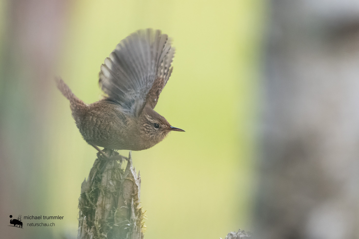 Der Zaunkönig ist neben den beiden Goldhähnchen einer unserer kleinsten / kürzesten Singvögel, da er seinen Schwanz oft steil aufstellt. Der kleine Kerl singt mit bis zu 90 dB, meist aus der Deckung, gelegentlich auch von Singwarten aus, unglaublich wie er mit seiner geringen Masse einen solchen Schallpegel hinkriegt, der seinen Gesang in bis zu 500m noch vernehmen lässt. Die beiden Geschlechter sind morphologisch nicht unterscheidbar, sie weisen also keinen Geschlechtsdimorphismus auf. Er brütet im dichten Unterholz, gerne in Wassernähe, was hier mit dem nahen Jungholzbächle ja gegeben wäre. Er flog dann auch tatsächlich nach Osten zum Jungholzbächle weg. Ich hoffe jetzt sehr darauf, dass mein Holzstapel ihm gefallen hat und er im nächsten Frühling vielleicht sogar hier brütet.