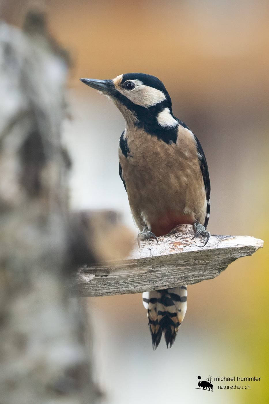 Es lohnt sich doch immer, genau hinzuschauen. Ein zweiter Buntspecht, ein Weibchen, nascht vom Fettfutter.