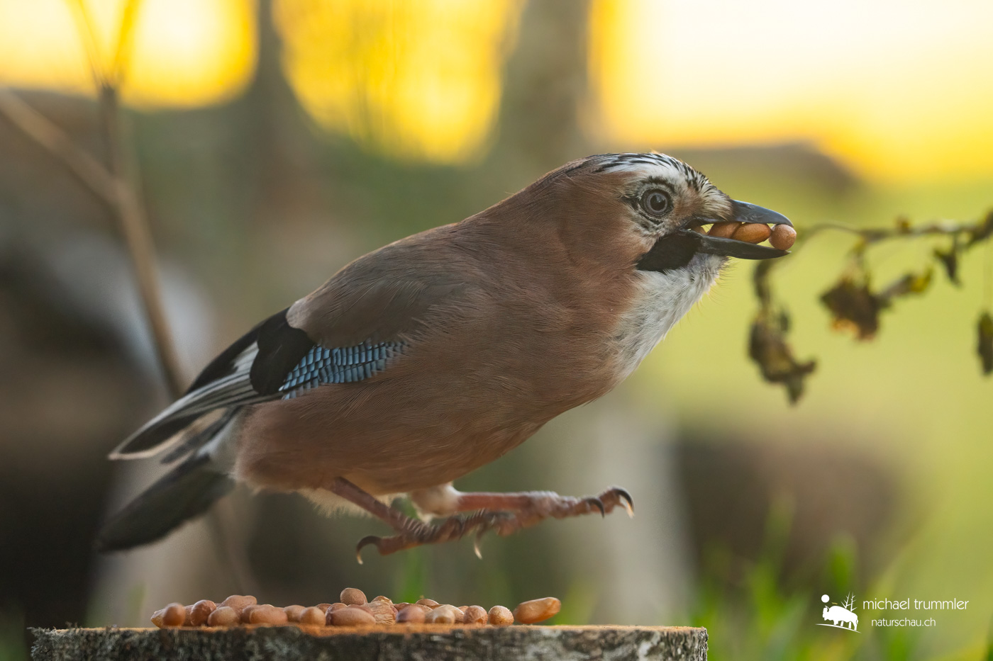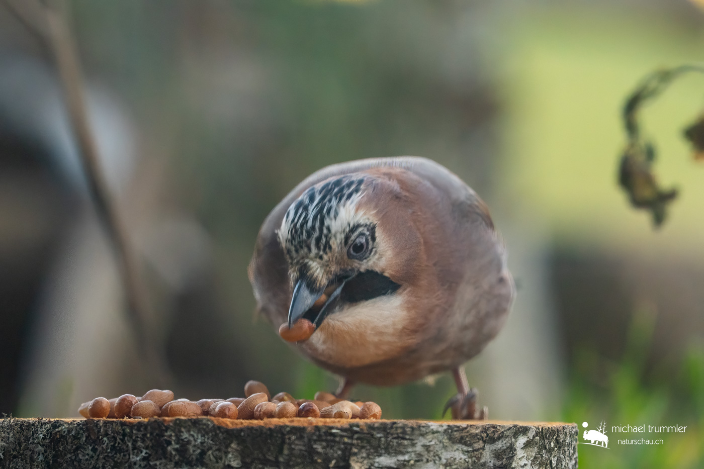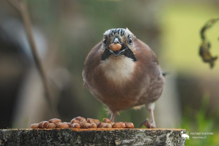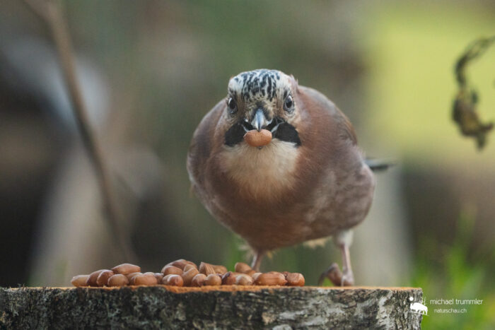 Immer wieder mal kam auch mal ein Eichelhäher in meinem Garten vorbei. Da er aber nicht so viel anzufangen wusste mit dem vorhandenen Futter, richtete ich eine Futterstelle mit (natürlich ungesalzenen) Erdnüssen auf einem Birkenstumpf ein. Und prompt, heute war er wieder da.
