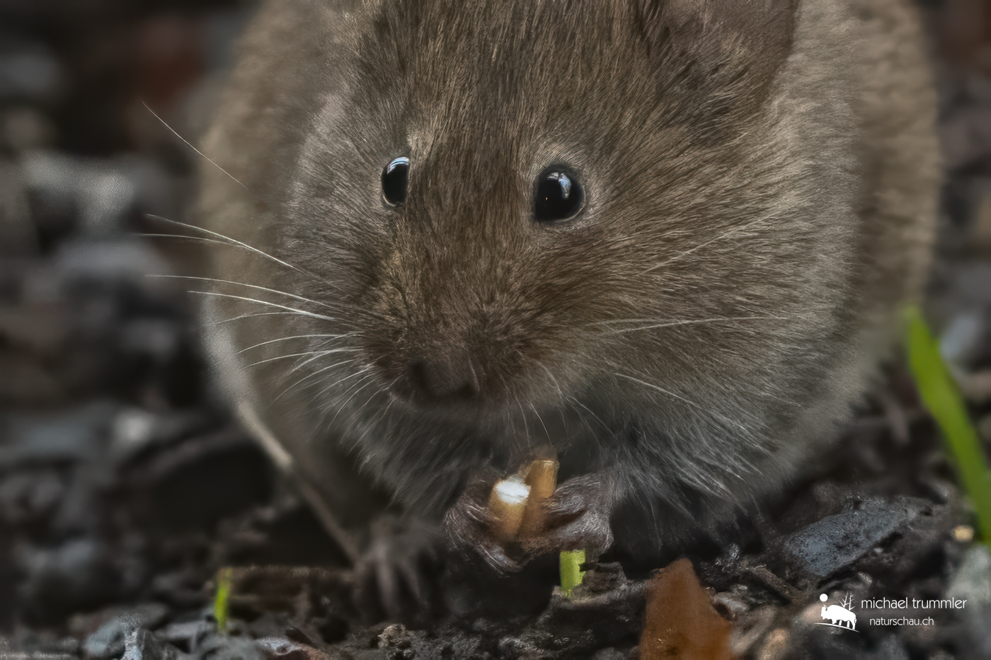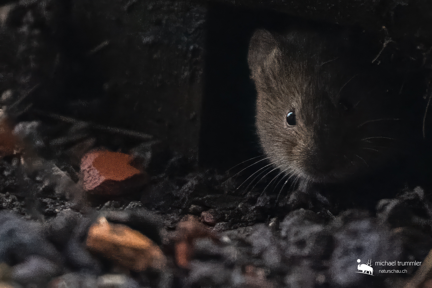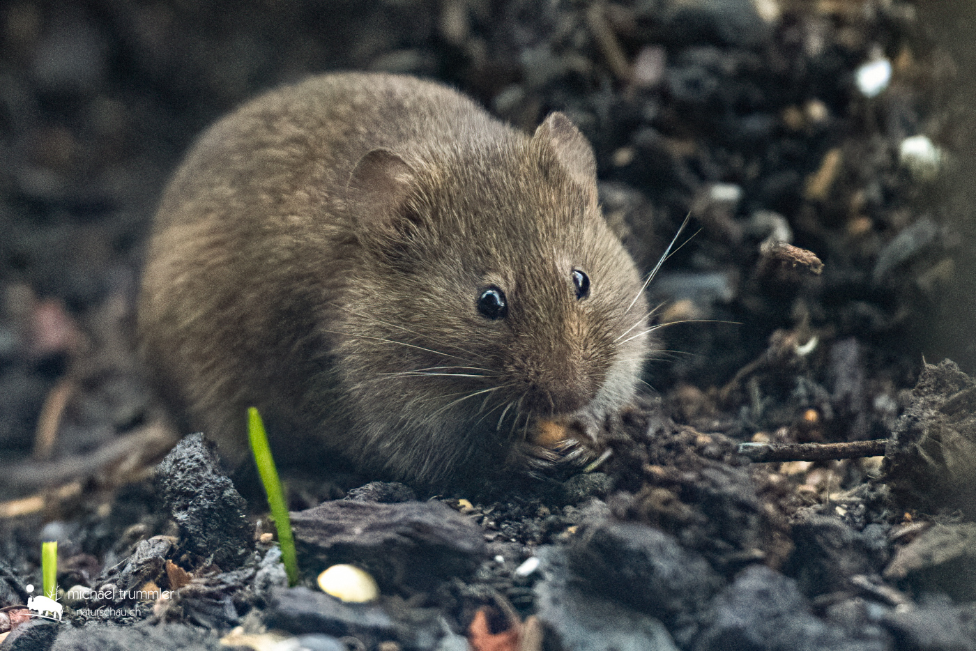Heute ist mein persönlicher „ Tag der Wühlmaus “. Dass mein Teichhügel von mindestens zwei Mäusen bewohnt ist, wusste ich ja schon lange, siehe auch die Nachtaufnahmen aus früheren Monaten. Inzwischen haben sich die mindestens zwei geschätzte 30 Ausgänge gegraben (ich bin ja gespannt, wie es innerhalb des Hügels aussieht), teils quer durch die Pflanzen durch. Mal sehen, was im Frühjahr noch wächst. Die Bergenien schieben jedenfalls die ersten grünen Blätter bereits aus dem Boden. Aber zurück zur Maus: Heute hatte ich ausgiebig Gelegenheit, die beiden zu beobachten. Leider waren sie nie nahe beisammen, so dass ich nicht beide in einem Bild zeigen kann. Die Maiskörner, die von der Futtersäule oberhalb herunterfallen, scheinen jedenfalls zu schmecken. Beide waren aber äusserst aufmerksam und verschwanden bei der geringsten Bewegung blitzartig in ihrem Gangsystem. Die Speziesidentifikation bleibt noch etwas im Ungefähren. Es dürfte sich aber ziemlich sicher um eine Wühlmausart handeln (leider gibt es davon etwa 150 verschiedene). Kucke ich die verschiedenen Bilder der Spezies an, denke ich am ehesten an eine Rötelmaus (Myodes glareolus). Früher dachte ich an eine Waldmaus (Apodemus sylvaticus), die Augen sind aber wohl doch zu klein, als dass es eine Waldmaus wäre.