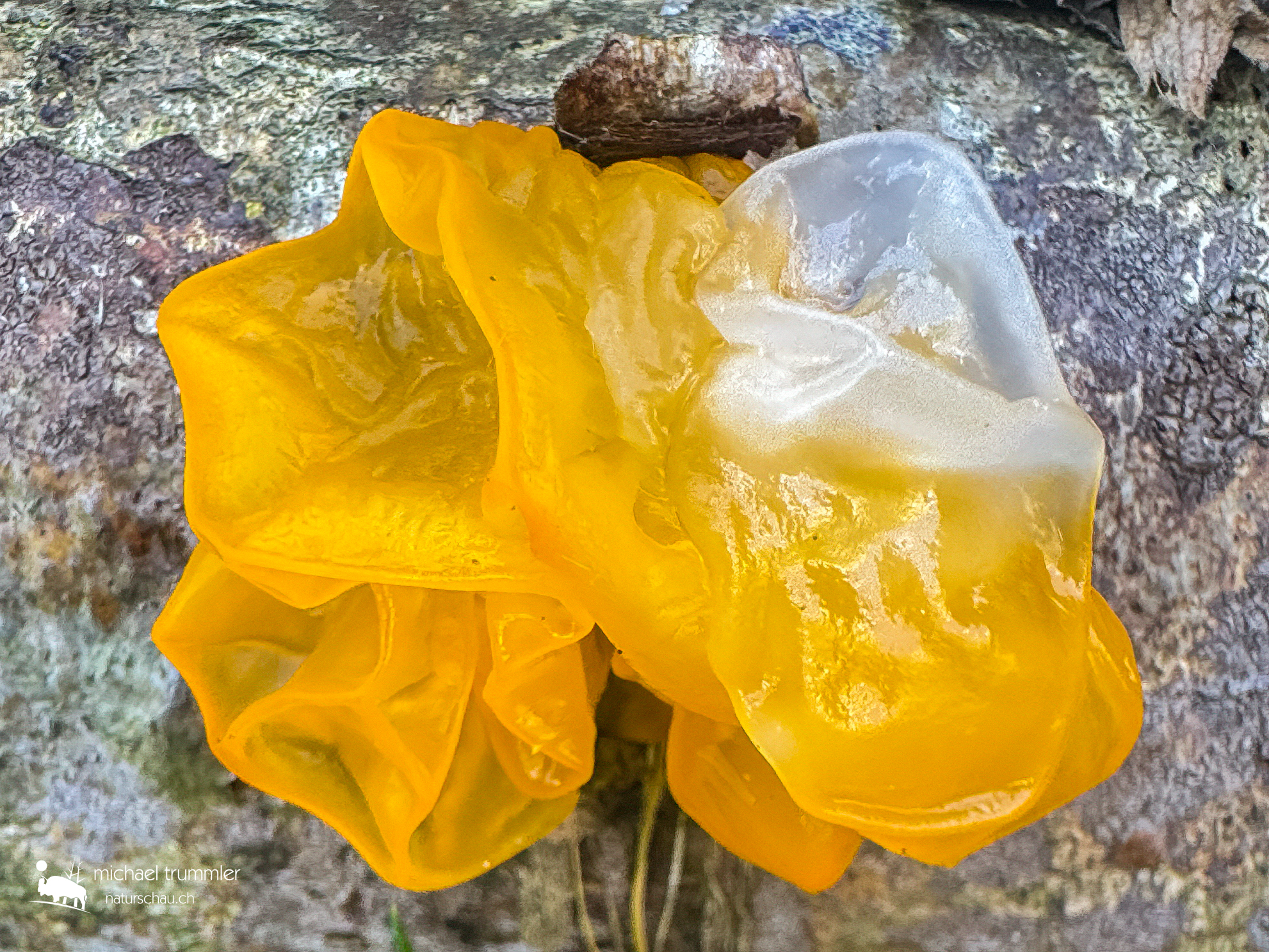 Dabei handelt es sich um einen weltweit verbreiteten Pilz, der überwiegend an toten Ästen und Zweigen wächst und seinerseits holzzersetzende Pilze aus der Gattung der Zystidenrindenpilze parasitiert. Er wächst aus Rindenspalten und erscheint bei feuchtem Wetter, dazu passten ja die letzten Tage hier oben. Bei Trockenheit schrumpft er bis auf kleine Reste zusammen, lebt bei feuchter Witterung aber erneut wieder auf. Offenbar ist er essbar, anscheinend wird in China eine kühle Suppe unter anderem aus ihm zubereitet. Die Wissenschaft gewinnt aus ihm Glucuronoxylmannan, welches immunstimulierende und antidiabetische Wirkung haben soll, daneben Entzündungshemmung sowie Cholesterin-senkende und kardioprotektive Wirkung aufweisen soll (Wikipedia, 2025).