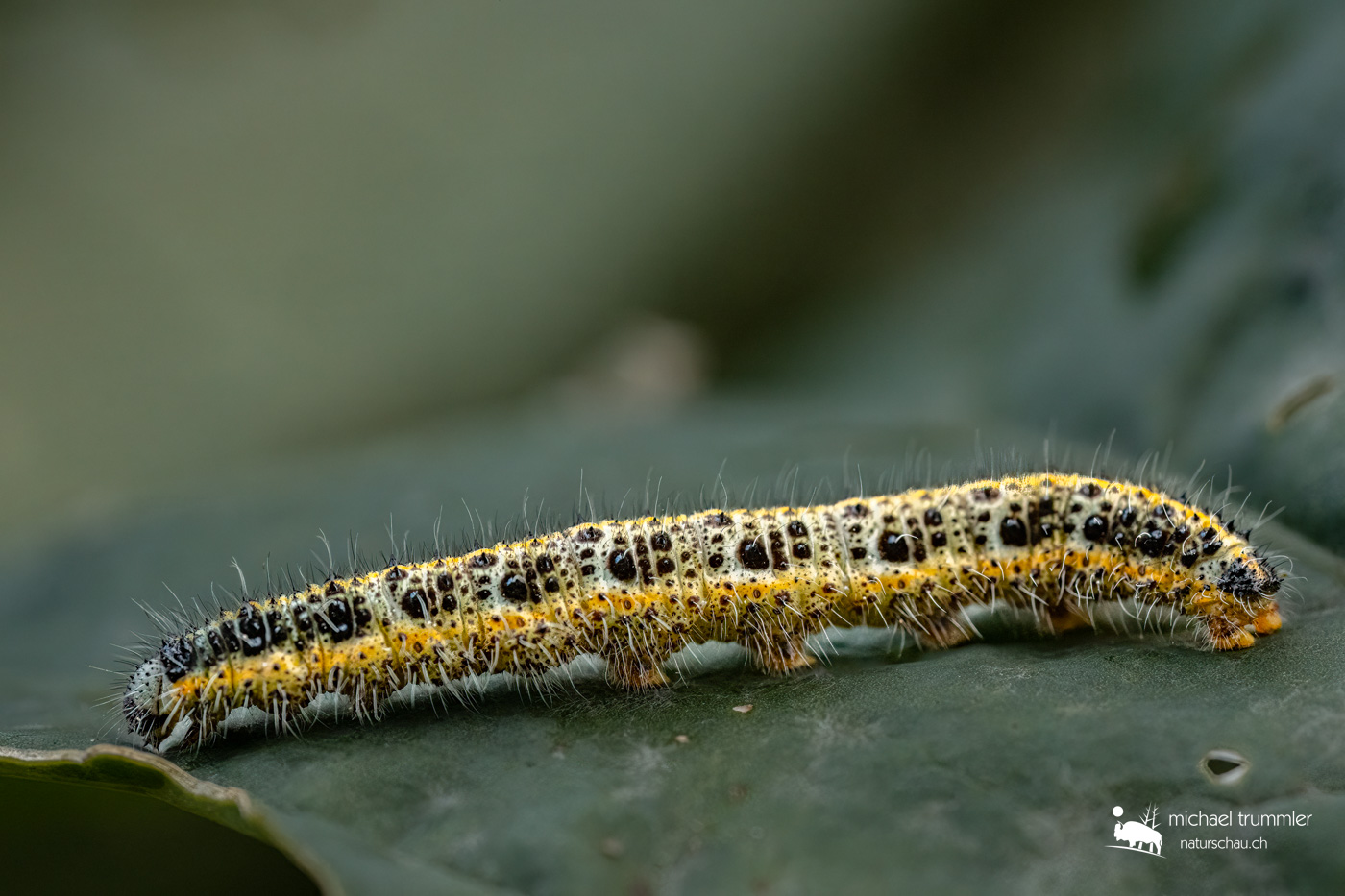 Diese wunderschöne Raupe wird aus landwirtschaftlicher Nutzpflanzenanbau – Sicht als Schädling betrachtet, aus „natürlicher“ Sicht gibt es natürlich gar keine Schädlinge. Wie auch immer, die Raupe des grossen Kohlweisslings (Pieris brassicae) frisst sich hier auf einer Rapspflanze (Brassica napus) die letzten Reserven für den Übergang ins Puppenstadium an (oder überwintert in milden Wintern gelegentlich auch als Raupe). Im Lauf ihres Lebens macht die Raupe vier Häutungen durch, wodurch sie zunehmend dunkler wird. Alte Raupen weisen wie hier die dunklen Flecken auf gelbem Grund auf und sind behaart (junge Raupen haben keine Behaarung). Die schwarz-gelbe Färbung wird von Prädatoren als Warnung verstanden, zusätzlich nehmen die Raupen aus ihrer Futterpflanze Isothiocyanate auf (Schwefelverbindungen), die sie zur Abschreckung einsetzen.