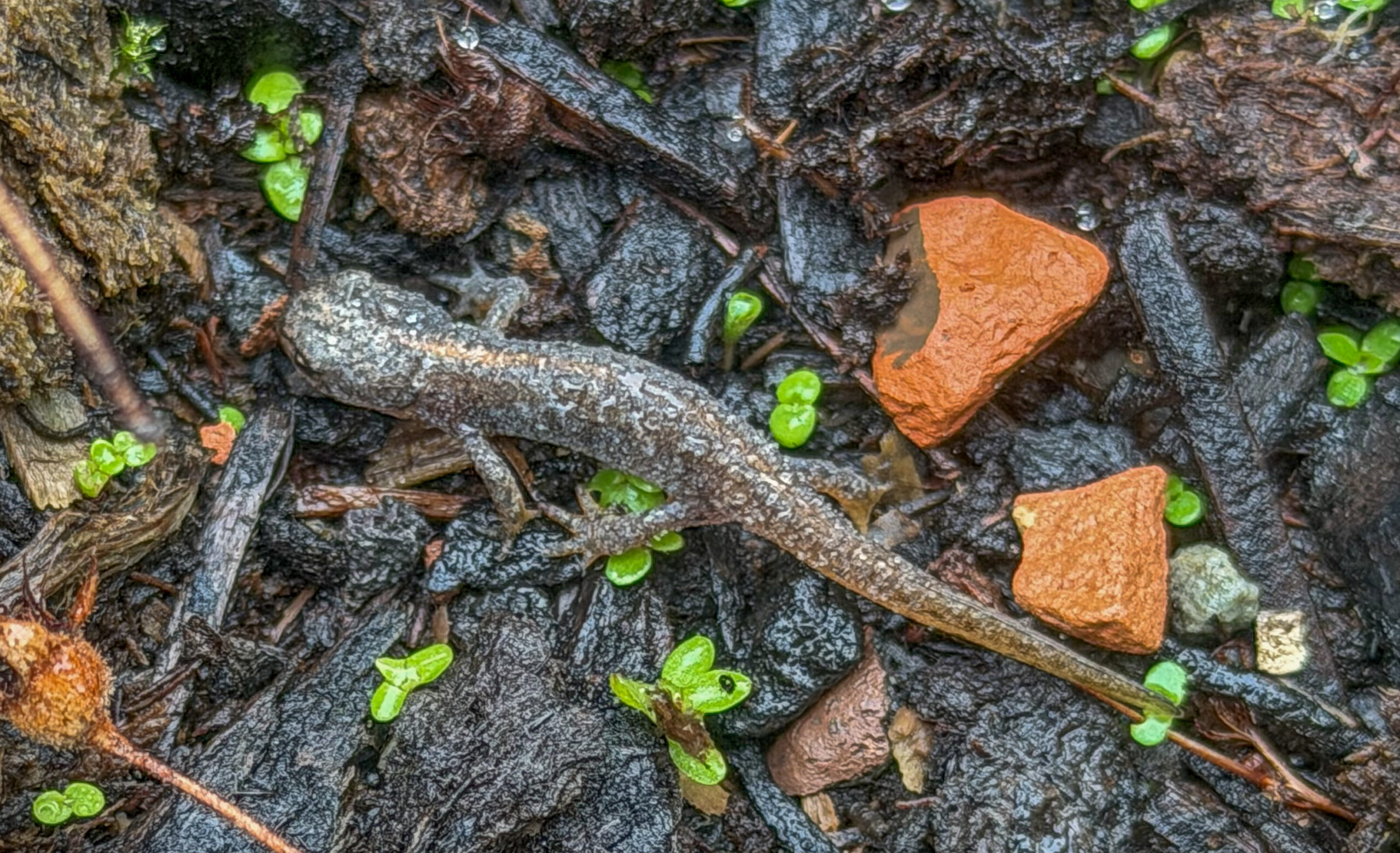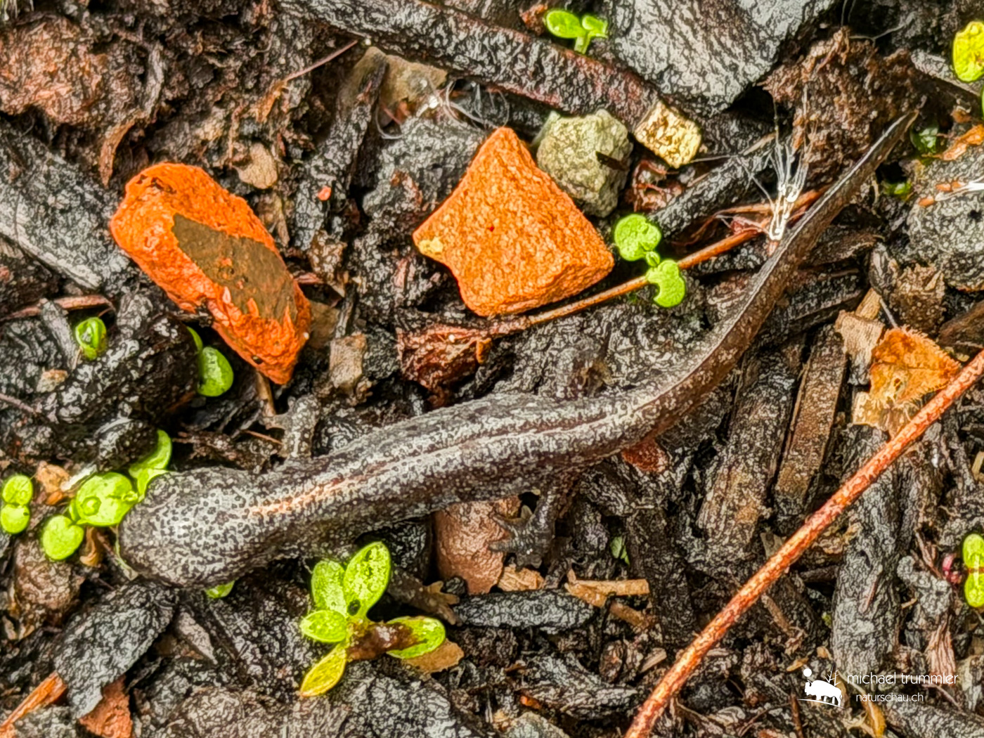 An derselben Stelle, wo Andrea den ersten jungen Bergmolch entdeckte, fand sie im regnerischen Wetter heute einen zweiten. Im Bildvergleich schwierig zu entscheiden, ob es ein zweiter neuer Bergmolch ist, oder ob ich doch zu optimistisch war, mein Biotop als ideal für ihn zu halten und der erstgefundene wieder ausbüxen wollte? Jedenfalls setzte ich ihn an die identische Stelle wie Molch Nr 1, wo er dann gleich auch unter die schützende Pflanzendecke schlüpfte. Mal sehen, was passiert.