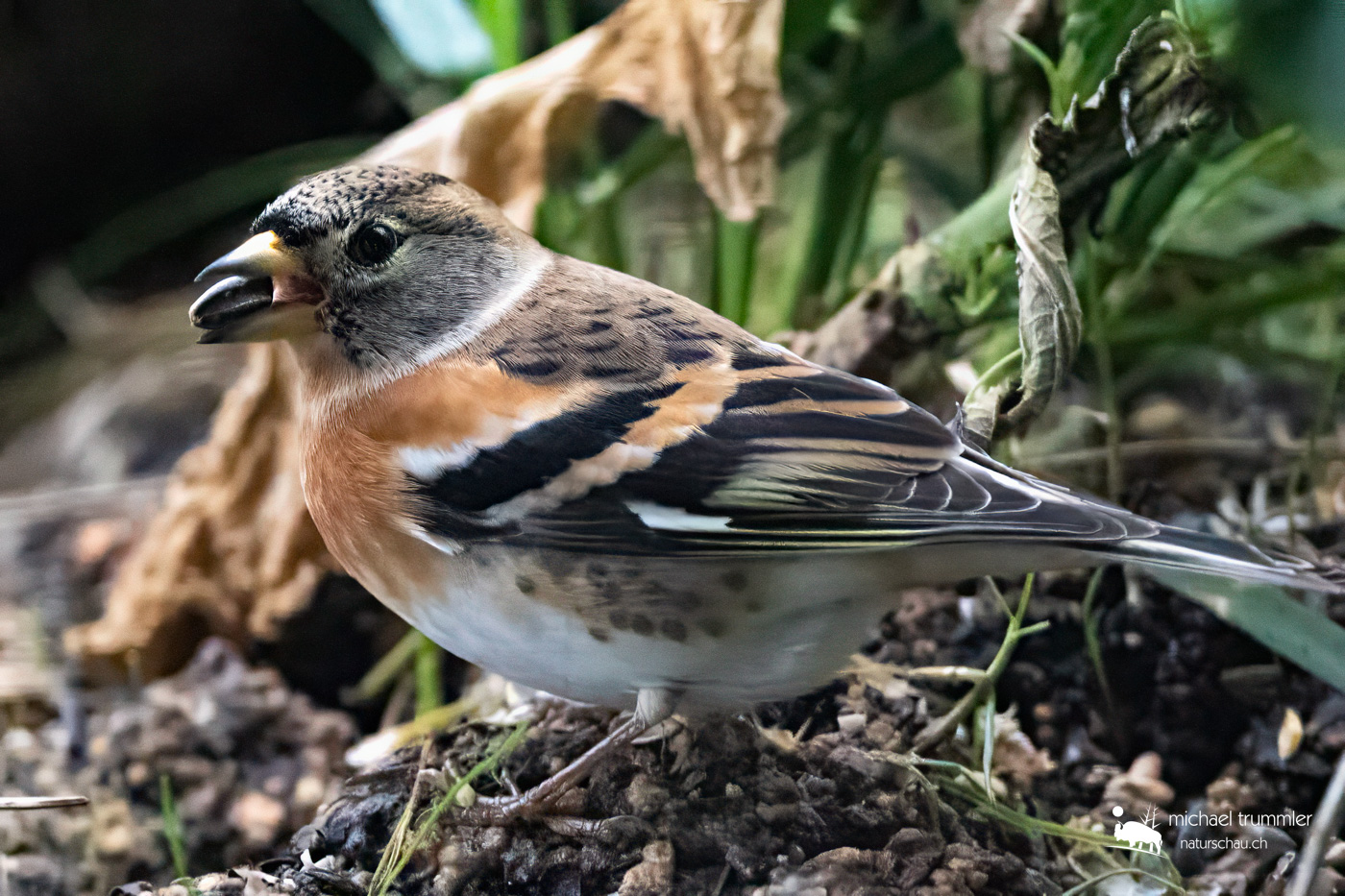 Ab Mitte September ziehen sie aus ihren Brutgebieten in den Wäldern Nordeuropas gegen Süden, wo sie überwintern. Ihr Überwinterungsgebiet deckt sich mit der Verbreitung der Buche, deren Nüsschen ihre Hauptnahrung im Winter darstellt. Grosse Beachtung finden die unregelmässig stattfindenden Masseneinflüge hunderttausender Individuen, welche insbesondere erfolgen, wenn im Norden strenge Winterbedingungen herrschen. Einen solchen Masseneinflug durfte ich anfangs Januar 2024 im schweizerischen Langenthal erleben, wo geschätzte 1 – 3 Mio (!!) Bergfinken abendlich ihren Schlafplatz aufsuchten. Das Rauschen der Flugformationen und nicht enden wollende Gezwitscher werde ich nie vergessen. Natürlich sind dann auch Prädatoren nicht weit, wie Sperber und Habicht, die sich am Tisch bedienen wollen. Ein Schwarm verleiht aber auch Schutz, da die schiere Masse die Beutewahl deutlich erschwert. Der Habicht unten rechts war dennoch erfolgreich.