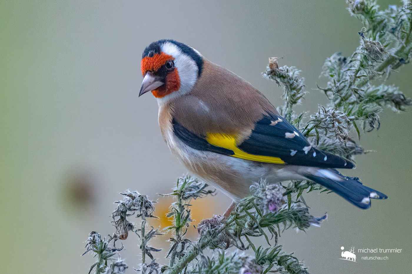 Neben dem Bergfink heute erfreuen mich immer wieder die aus 4-5 Individuen bestehenden Grüppchen Distelfinken (Carduelis carduelis), auch als Stieglitz bekannt, die sich auf Natternkopf (Echium vulgare) und gelbem Sonnenhut (Rudbeckia) einfinden. Sie bringen Farbe ins baldige Weiss.